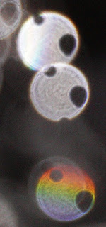I took the photos below while photographing only ordinary drops of pure, clean water falling in front of a black featureless background. On this day I got in almost all of 400+ consecutive photos an orb pattern consisting of a small hole on the left and a larger hole on the right. Below are some examples.